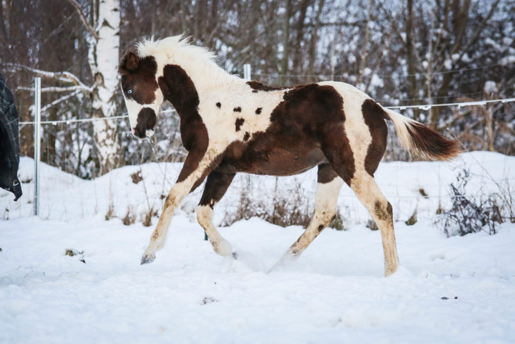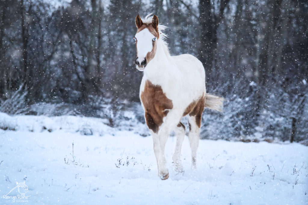Snow kam als Absetzer von der Mörsch Ranch zu uns und bereicherte unsere Herde von Anfang an mit ihrer offenen Art. Sie ist sehr neugierig, erkundungsfreudig und immer interessiert an ihrer Umgebung. Als Zuchtstute hat sie uns bereits ein Stutfohlen geschenkt.